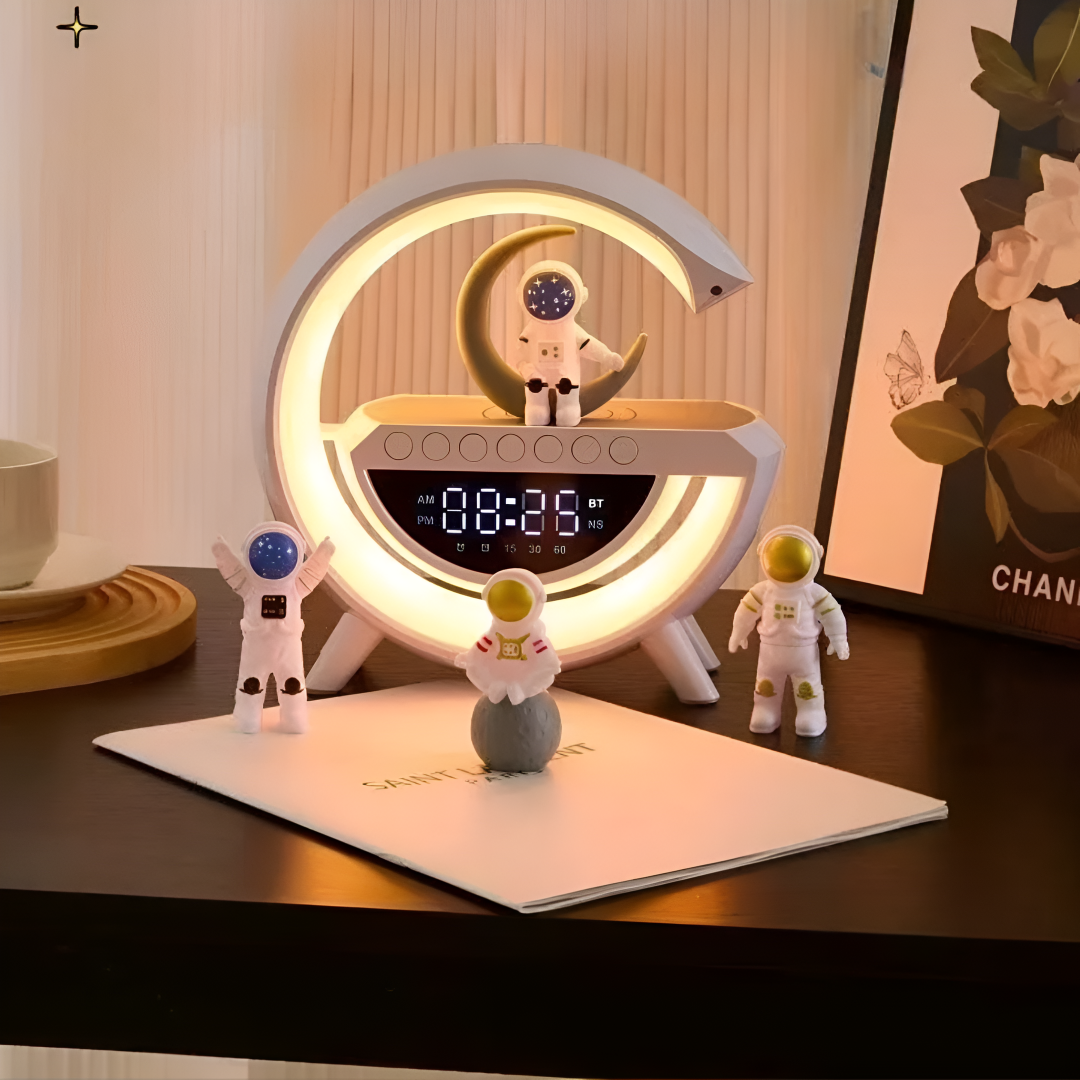 Con un diseño en forma de G futurista y materiales resistentes, esta lámpara no solo embellece tu espacio, sino que lo transforma. Además, tiene batería de respaldo, función de reloj despertador, y se controla con un solo botón para cambiar los modos de luz.